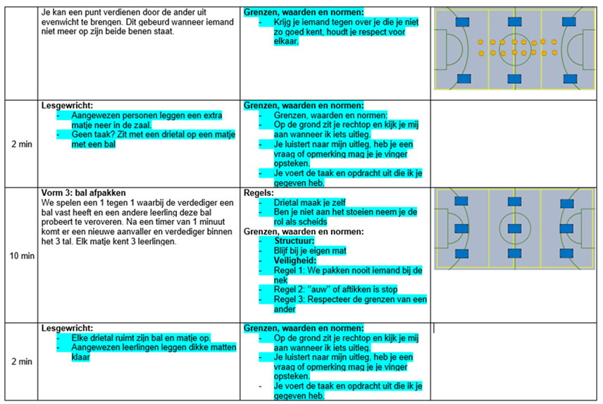 Op maandag 10 maart heb ik 2 keer dezelfde les gegeven aan twee eerste klassen. De les bestond uit de thema’s stoeispellen en floorball. Nu is het zo dat de inhoud van het leerstof en theorie minder belangrijk is in deze les voor mij als lesgever. Wat in deze les terug moet komen is, dat de regels worden nageleefd en mijn grenzen niet worden overschreden. Stoeispellen is een onderdeel waarbij je moet leren om uit je comfortzone te stappen omdat je in fysieke aanraking komt met medeleerlingen. Ook kreeg ik de afgelopen periode vaak als feedback van mijn stagebegeleiders terug dat ik mijn lessen nog gestructureerder neer moet zetten. Niet alleen omdat dit de klassenveiligheid bevorderd, maar ook mijn eigen bekwaamheid in het lesgeven. In de onderstaande lesvoorbereiding zie je alles wat met structuur te maken heeft met blauw gemarkeerd. Het gaat hierbij om algemene regels binnen de gymzaal en de oefenvormen. Ook mijn grenzen, waarden en normen staan beschreven in mijn lesvoorbereiding. Wanneer ik hier consequent naar ga handelen verbeter ik mijzelf als didacticus. Ook krijgen de leerlingen minimaal de ruimte in de les om ongewenst gedrag te vertonen.