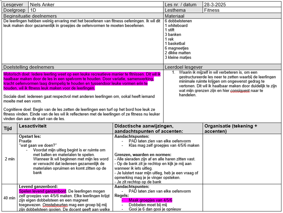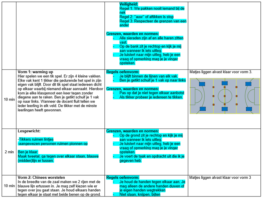 Op maandag 10 maart heb ik 2 keer dezelfde les gegeven aan twee eerste klassen. De les bestond uit de thema’s stoeispellen en floorball. Nu is het zo dat de inhoud van het leerstof en theorie minder belangrijk is in deze les voor mij als lesgever. Wat in deze les terug moet komen is, dat de regels worden nageleefd en mijn grenzen niet worden overschreden. Stoeispellen is een onderdeel waarbij je moet leren om uit je comfortzone te stappen omdat je in fysieke aanraking komt met medeleerlingen. Ook kreeg ik de afgelopen periode vaak als feedback van mijn stagebegeleiders terug dat ik mijn lessen nog gestructureerder neer moet zetten. Niet alleen omdat dit de klassenveiligheid bevorderd, maar ook mijn eigen bekwaamheid in het lesgeven. In de onderstaande lesvoorbereiding zie je alles wat met structuur te maken heeft met blauw gemarkeerd. Het gaat hierbij om algemene regels binnen de gymzaal en de oefenvormen. Ook mijn grenzen, waarden en normen staan beschreven in mijn lesvoorbereiding. Wanneer ik hier consequent naar ga handelen verbeter ik mijzelf als didacticus. Ook krijgen de leerlingen minimaal de ruimte in de les om ongewenst gedrag te vertonen.