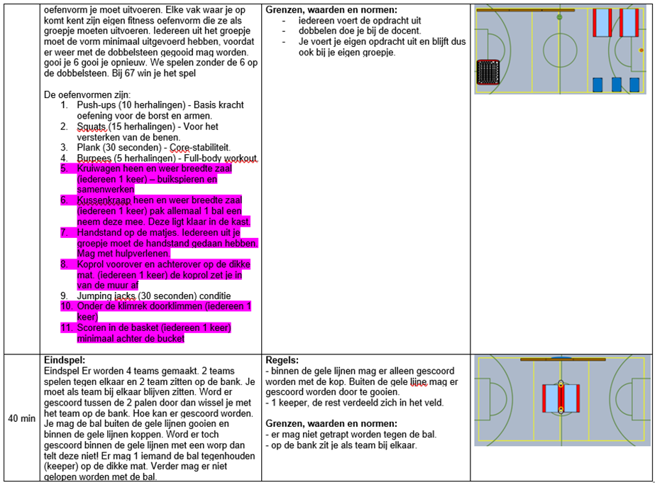 We eindigen met een floorball 5 tegen 5 partij. Om tot eerlijke teams te komen en toch een stukje autonomie mee te geven mag de klas zelf 4 teams maken. Elk team moet wel minimaal 3 meiden hebben. Als de teams zijn gemaakt moet elk team 3 eigenschappen beschrijven die zij belangrijk vinden in een team. Bijvoorbeeld eerlijk spelen, flexibiliteit of behulpzaamheid. Ook zijn er bepaalde regels wat ik belangrijk vind bij het spelen van floorball. Voor de veiligheid wil ik dat je de stick onder je knieën houdt. Heb je de stick toch hoger kan dat gevaarlijk zijn. Ook mag je geen bodychecks uitdelen. Floorball is geen contactsport. Het is niet toegestaan om tegen andere spelers aan te lopen of ze op een ruwe manier van de bal af te duwen. Ben je niet aan het spelen en zit je op de bank te wachten blijf je bij je eigen groepje zitten. Door leerlingen bij hun eigen team te laten zitten creëer je meer structuur en blijven ze meer gefocust bij de eindvorm.